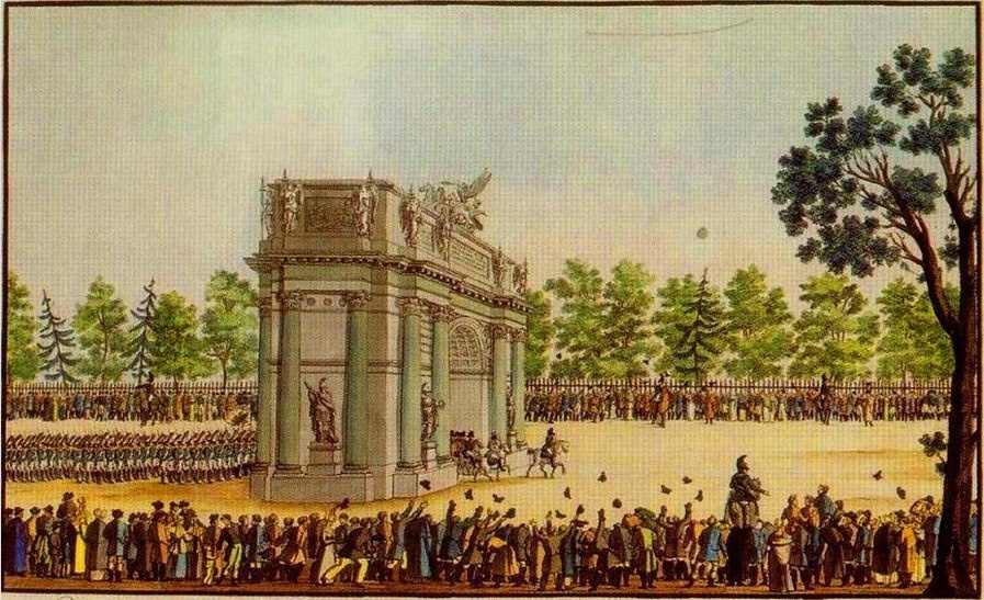 11 августа 1814 года "Лейб-гвардии полки Преображенский, Семёновский, Измайловский, Егерский, Гвардейский морской экипаж и две роты гвардейской артиллерии, возвратившиеся из славного своего похода, вступили в сию столицу. Они проходили чрез Триумфальные ворота, воздвигнутые от города в честь и славу великих подвигов, возвративших мир Европе…" (из газеты "Северная почта")