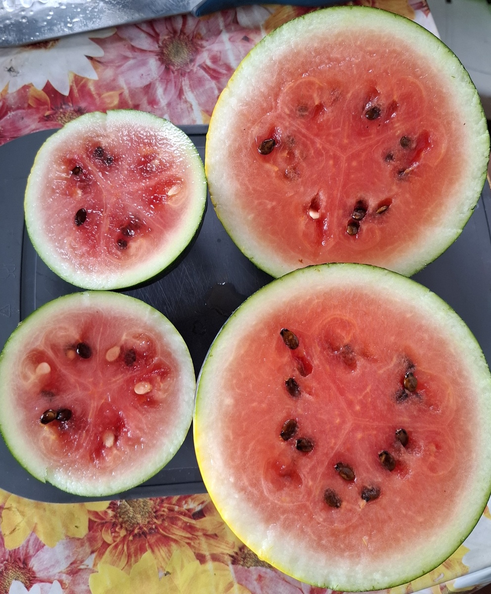 В общем, вот такие: Справа в районе 1 кг, а левый размером с апельсин так и остался. Вот что бывает, когда растущие плоды попадают на ночные низкие температуры😔 При этом они полностью вызрели, очень сладкие и сочные. Жаль, размер не удался. Но тут и сезон такой, хорошо, хоть что-то получилось. На грядке лежат ещё штук 10, все некрупные.