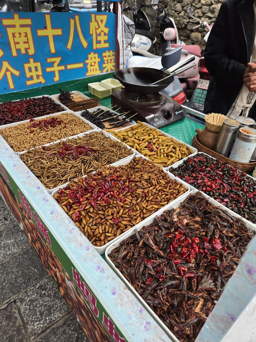 Разбавлю вашу ленту небольшой порцией шок-контента, открывайте фотки на свой страх и риск 😅 Мы сейчас в городе Дали и наконец-то удалось в одном месте найти все пугалки из историй про всеядных китайцев. На этом прилавке разместились кузнечики, всякие личинки, но самое главное — скорпионы, тарантулы и сороконожки (или многоножки, я не считал). В общем, красотища) Пока не пробовал, у меня за последний месяц и так много всякого «хитинового белка» в рационе в виде шелкопрядов и цикад. Но думаю, что надо будет до отъезда таки заморить червячка заточить паучка...