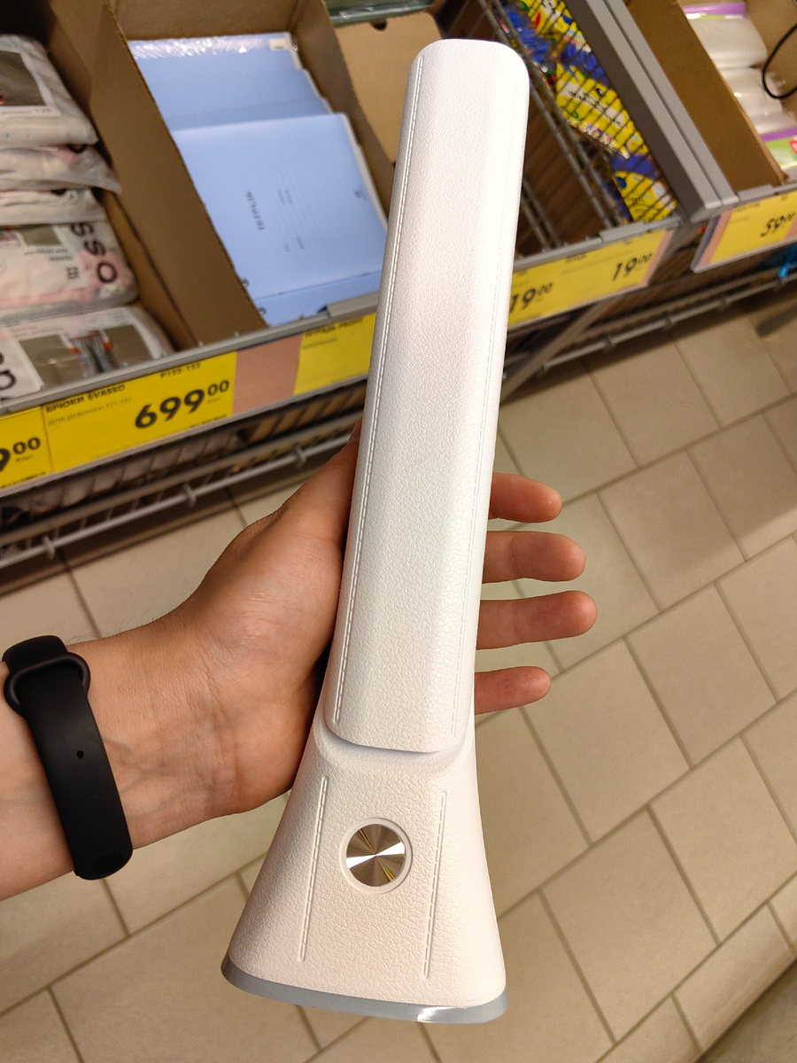 На очереди вторая часть новинок из магазина Чижик. Подождала, пока расставят весь товар и появятся ценники. Что нового? Складная новинка, оформление достойное, на пластиковом корпусе нет неровностей, заусениц, покажу поближе, корпус с мелким рельефом, узор как у предметов из кожи, не гладкий пластик. Кнопка одна, крупная. Раскладывается, можно изменить угол наклона. Максимально 180 градусов. В сложенном виде часть со светодиодами повернута к корпусу, защищена. Светильник с кабелем, работает от сети. Три режима, от теплого до холодного. Переключается без усилий. Сам по себе светильник устойчивый. Пригодится школьникам и не только, на рабочем столе поставить, или рядом при чтении книг, при рукоделии. За 799р. Выставили упаковки, внутри деревянная новинка. Это табурет, разобран. До этикетки не дотянуться, тяжелый. Поэтому покажу, как на деле вот такой и будет. Полностью деревянный. Местами поверхность не гладкая, лучше пройтись "шкуркой". Табурет без покрытия, опять же, покрасить