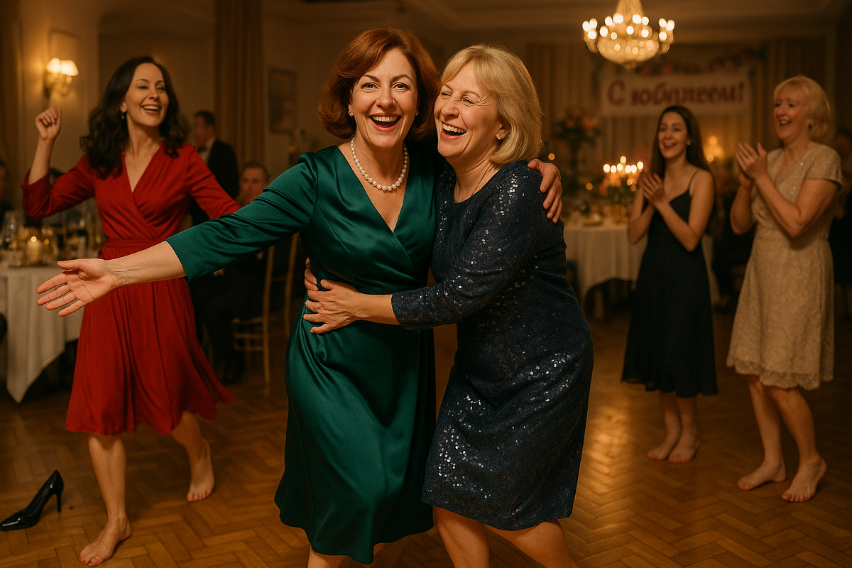 Несколько секунд стояла тишина. Потом засмеялись женщины — по-настоящему, расслабленно. Кто-то из гостей, хихикая, тоже скинул каблуки. Даже Вера улыбнулась через слёзы и поднялась со стула, обняв Зою так крепко, будто впервые за весь вечер почувствовала себя живой.