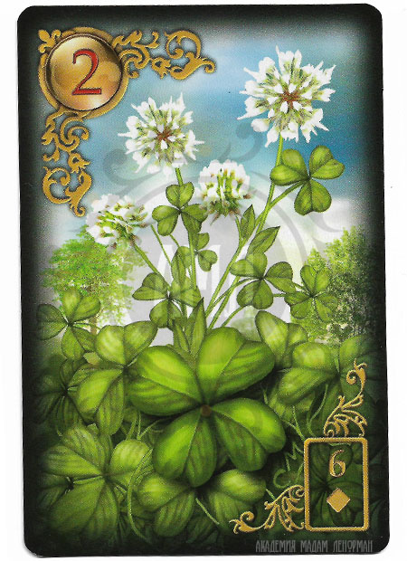 КЛЕВЕР Мечты и грёзы. Надежда на тепло и уют, перемены к лучшему, ожидание тихого счастья. Маленькие радости. Простота, скромность. Бесхитростность. Естественность. Приспосабливаемость. Интуитивная прозорливость. Удача, сюрприз. Маленькие деньги. Недорогой подарок. Добрый знак. Быстрота и кратковременность событий. «Клевер» карта надежды. Она обычно приносит счастье и удачу, но окончательная трактовка зависит от окружающих карт. Если карта «клевер» находится рядом с личной картой, это значит, что проблемы сегодняшнего дня скоро исчезнут. В этом случае карта вселяет надежду и оптимизм. Она придаёт мужество и уверенность. Любые огорчения будут кратковременны, и радость вновь возвратится. Все Ваши мечты исполнимы, даже самые невероятные. Клевер, как простой полевой цветок, приносит безыскусное, тихое земное счастье. Покой и уют. Но это растение хрупкое и быстро вянет. Счастье и радость недолговечны под этой картой. Карта «клевер» символизирует призыв оставить одиночество. Идите на контак