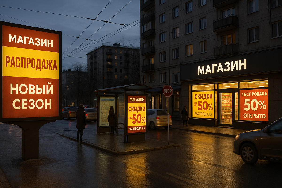 Розничная торговля – сфера, где офлайн-присутствие играет решающую роль. Наружная реклама для розничного магазина – это не просто билборды, а весь комплекс визуальных коммуникаций вокруг точки продаж. Грамотно оформленная витрина, заметная вывеска, указатели, баннеры со скидками – все это помогает привлечь проходящий поток и увеличить выручку магазина. В данном материале рассмотрим, какие инструменты включает наружная реклама для розничного магазина и как их эффективно использовать. Основной элемент – вывеска магазина. Она должна четко отражать название и профиль торговой точки. Хорошая вывеска видна издалека, читается мгновенно и остается в памяти. Для розницы вывеска – это одновременно реклама и навигация: без нее потенциальные клиенты могут просто пройти мимо. Например, яркая фирменная вывеска супермаркета “Азбука Вкуса” сразу сигнализирует о премиум-формате магазина и привлекает соответствующую аудиторию. Наружная реклама розничного магазина начинается с фасада: кроме вывески, офор