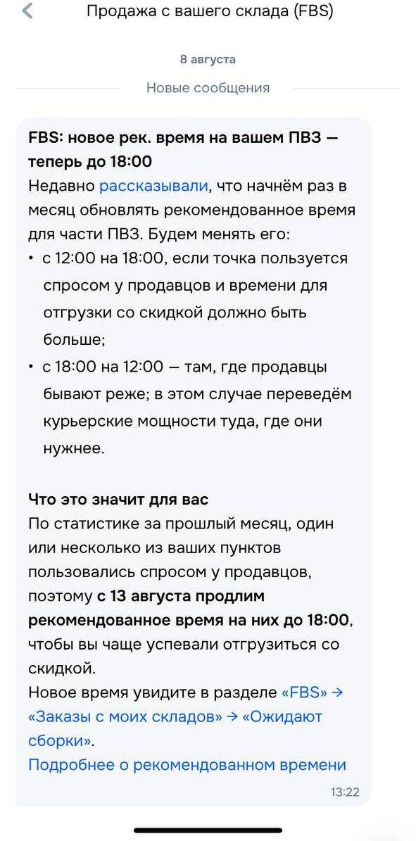 Ozon меняет рекомендованное время отгрузки для FBS Селлеры начали получать уведомления о смене рекомендованного времени на своих ПВЗ. Теперь Ozon раз в месяц будет пересматривать график: — с 12:00 на 18:00 — если точка популярна у продавцов и нужно больше времени для отгрузки со скидкой; — с 18:00 на 12:00 — если точка используется редко, чтобы перенаправить курьеров туда, где они нужнее. С 13 августа для некоторых ПВЗ время продлят до 18:00. Проверьте у себя — возможно, изменения уже вступили в силу. Marketplace_biz - отдай свой буст каналу