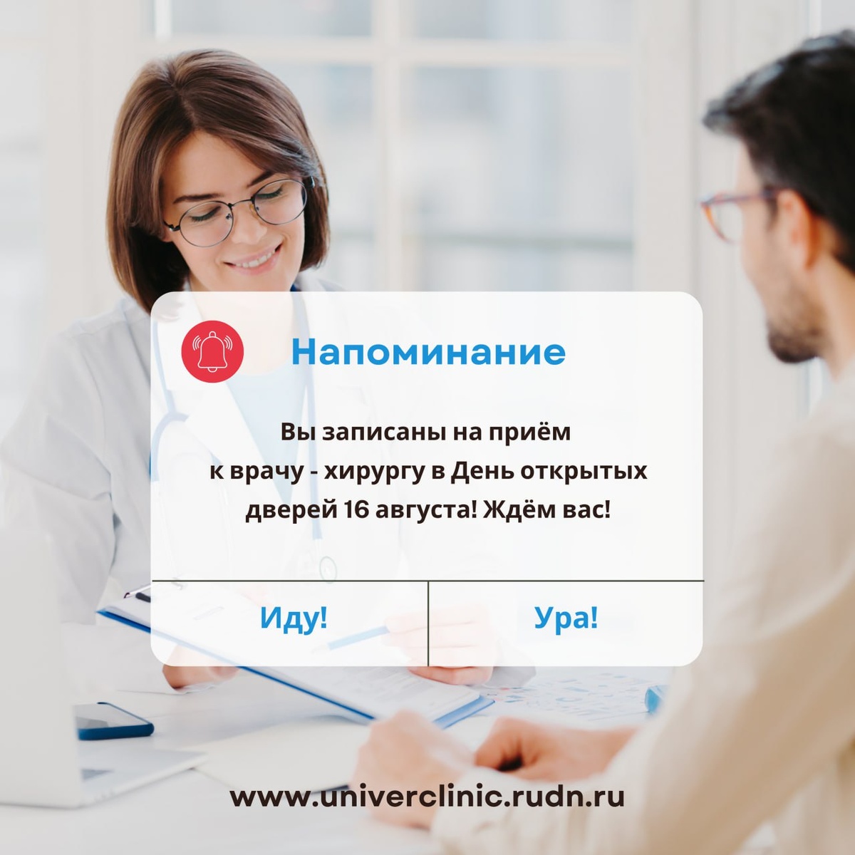День открытых дверей. Мы вас ждём! 👉 Уже в эту субботу - 16 августа - вы сможете получить консультацию врача – хирурга в Университетском клиническом центре им. В.В. Виноградова (филиал) РУДН в День открытых дверей! Задать важные вопросы, получить рекомендации высококлассных специалистов – быстро, удобно и качественно! Посвятите выходной день вашему здоровью. Пациенты с паспортом РФ и полисом ОМС бесплатно смогут с 9:00 до 15:00 посетить врача в кабинетах Консультационно-диагностического отделения. Предварительная запись по телефону: 📱 +74951034666 📍 Адрес: г. Москва, ул. Вавилова, д.61, стр.2