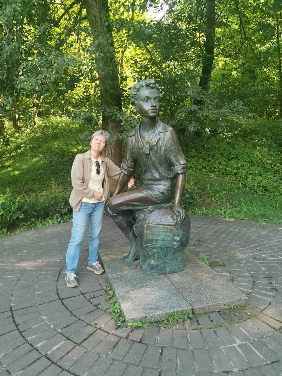 Стоит, наверное, объяснить для новичков, что это за рубрика. Уже около 10 лет, бывая в разных городах, я стала делать фото на фоне памятника Пушкину. С годами это превратилось в коллекцию. И теперь уже, путешестуя, мы специально смотрим, есть ли в этом месте Пушкин и идем к нему. Бывает, что памятник очень скромный, бюстик. А бывает роскошный. Причём в городах, где Пушкин не был, памятник может быть шикарнее, чем в тех, где он был. А Пушкина по стране и миру много. Вроде бы больше 400. В моей коллекции их пока чуть больше 50. Полную коллекцию можно увидеть в подборке. Там и Красноярск, и Йошкар-Ола, и Владивосток, и Ереван, и Баку и др. Последний раз остановились мы вот на этом. После небольшой поездки на Кудыкину гору коллекция Пушкина пополнилась. 1. ЗАХАРОВО Памятник юному поэту появился здесь в 1999 г. Скульптор Алексей Хижняк. Пушкину 12 лет, он готов к поступлению в Царскосельский лицей. Пушкин и его бабушка Мария Ганнибал. Скульптор А. Е. Козинин Во Пскове можно увидеть Пушк