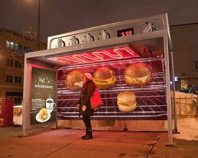 Перед вами из самых известных примеров ambient-рекламы в городской среде — «автобусная остановка-духовка» Caribou Coffee (Миннеаполис, около 2010 года; креатив агентства Colle+McVoy). Кампания продвигала новые горячие завтраки сети: сэндвичи, выпечку и кофе «горячие и полезные» (визуально это считывается по слогану «Hot & wholesome» на лайтбоксе слева). Идея родилась из очень простой инсайта: жители холодного северного города ждут транспорт, мёрзнут, мечтают о тепле и горячей еде. Если превратить само ожидание в тёплый, тактильный опыт — внимание и симпатия к бренду гарантированы. Конструкция остановки была переосмыслена под облик духового шкафа: сверху — макет панели с «ручками» и цифровыми часами (символично на фото 5:59, самое утро и время завтракать), внутри — полноразмерная графика решёток и булочек, создающая ощущение, будто пассажир стоит внутри печи. Ключевой ход — не только визуальная метафора, но и реальный обогрев: в потолок вмонтировали безопасные инфракрасные панели/теплов