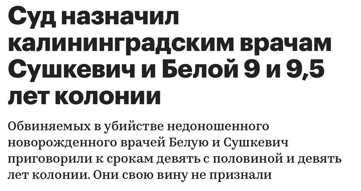 ⏺Калининградских врачей приговорил к огромным срокам из-за смерти недоношенного гражданина Узбекистана В ноябре 2018 уроженка Узбекистана Заримхон Ахмедова родила на 24 неделе беременности недоношенного мальчика весом 700 г. Ребенок не выжил и узбечка подала на врачей в суд обвиняя врачей в предумышленном убийстве. Судебные тяжбы длились два года. В декабре 2020 года суд присяжных в Калининграде оправдал экс-главврача роддома №4 Белую и неонатолога Сушкевич по делу о гибели недоношенного младенца гражданки Узбекистана. Обвинение этот вердикт не устроил, и дело отправили на пересмотр в Москву. В поддержку врачей Белой и Сушкевич высказывались врачи, в числе тех, кто призывал их оправдать — президент Национальной медицинской палаты Леонид Рошаль. Но ничего не помогло, во время текущего процесса сторона обвинения добивалась снятия неугодных присяжных. «Потерпевшая» Ахмедова даже не была на суде, т.к. кайфует в родном Узбекистане. Также суд в полном объеме удовлетворил гражданский иск