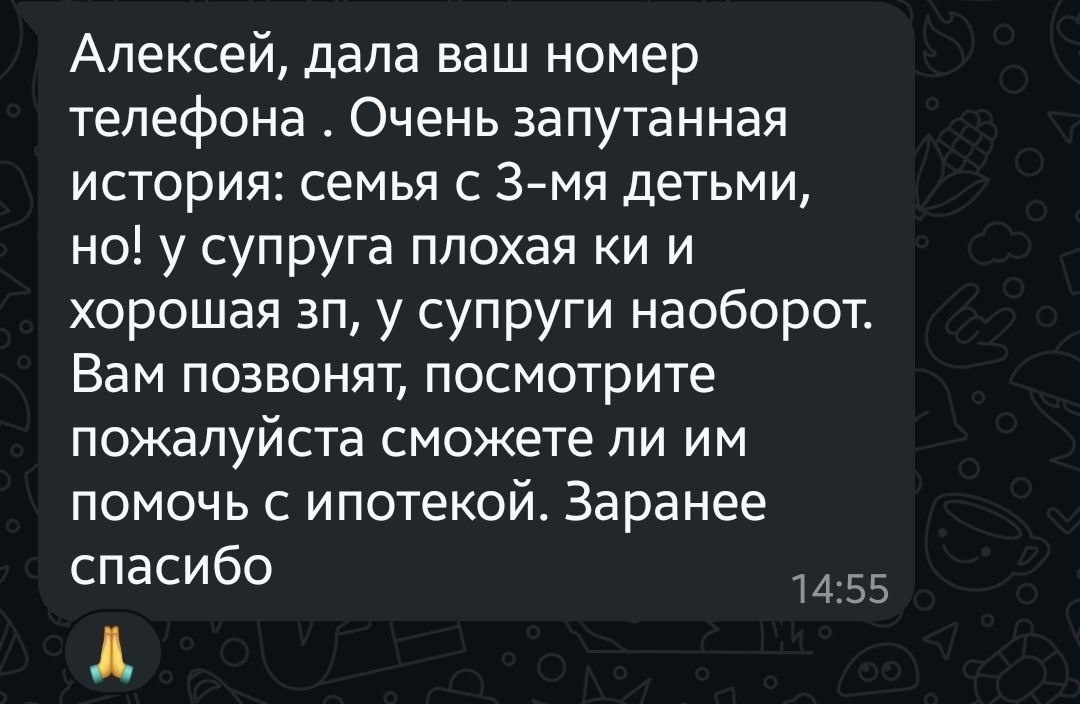 Абсолютно верная позиция у застройщика!! Аплодисменты! Честно. Итак, вы риелтор или застройщик и провели первичную верификацию клиента- что хочет, что с работой, какая кредитная история. И если услышали, то что пишет человек сразу ищем брокера. Не бегать по банкам с пакетом документов, а именно переслать их брокеру Я как брокер, по крайней мере сделаю анализ ситуации и дам вам, в отличие от банка обратную связь- это клиент для вас или "пассажир". Вы сэкономили ресурсы, и получили результат. Уважаемые застройщики и риелторы, если у вас примерно такая ситуация у клиента, пишите @ipotekaprosto1. И я дам ответ в течении дня, что можно с этим сделать и можно ли вообще