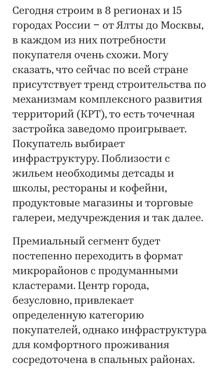 Иногда кажется что любая коммуникация застройщика это если не прямая ложь, то максимальное искажение действительности. Часто даже не в своих интересах, просто привычка такая, наверное. Директор ГК ТОЧНО транслирует в массы тезисы о том, что покупатель выбирает КРТ. Нет, это вы выбираете КРТ там где вам точечно строить не дают, а вовсе не покупатель. Никакой прямой связи между отсутствием инфраструктуры и точечной застройкой нет, скорее наоборот. Пример Москвы с натыканными домами посреди сложившейся застройки с инфраструктурой ушедшей цивилизации тому пример. Хорошо ли это, другой вопрос. Второй тезис ещё лучше, - премиум в спальных районах потому что там вся инфраструктура. Даже не знаю как это комментировать. Много премиальной инфраструктуры у ГК ТОЧНО в "родных просторах"? Ну ладно, "родные просторы" формат супер эконом. А как насчёт "патриков"? С каких пор соседство со складами, пром зонами, жд ветками и рай отделом судебных приставов стало признаком премиальной инфраструктуры?