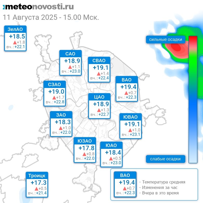В 15:00 в Москве было от +16.9°C до +20.7°C, средняя температура +18.8°C #погода #Москва #лето #температура #11августа #понедельник