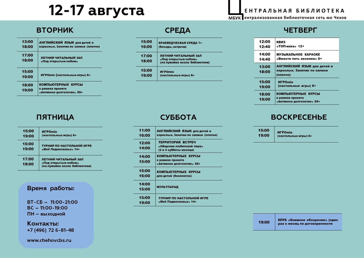 Центральная библиотека города Чехова приглашает вас посетить мероприятия и занятия в наших кружках.