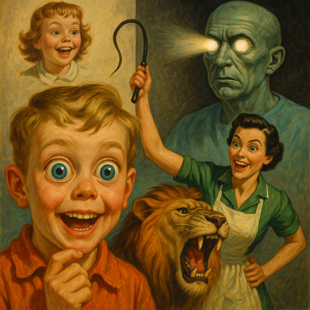 Взгляните на лицо улыбающегося ребёнка с рекламы мыла из 1954‑го: глаза широко распахнуты, губы растянуты в идеальной, но неестественной улыбке. Что-то в этом образе заставляет нервно поёжиться. Казалось бы — просто весёлое фото. Но в нём есть та странная нота, которая превращает милый сюжет в тревожный. 1950‑е — время, когда Америка жила между двумя полюсами. С одной стороны — рост экономики, вера в прогресс. С другой — холодная война, страх перед коммунизмом, атомной угрозой. Эти страхи просачивались в каждую область жизни: от политики до того, что висело на билбордах. Телевидение стремительно захватывало аудиторию, а улицы заполнялись яркими постерами. Рекламные щиты Burma‑Shave мелькали на шоссе, словно мини‑серии с короткими рифмами. Всё выглядело весело и безобидно — но под поверхностью всегда был намёк на контроль и внушение. Взгляните на рекламу зубной пасты тех лет: дети с сияющими зубами улыбаются так широко, что кажется — это маска. Мужчины держат в руках сигареты с видом аб