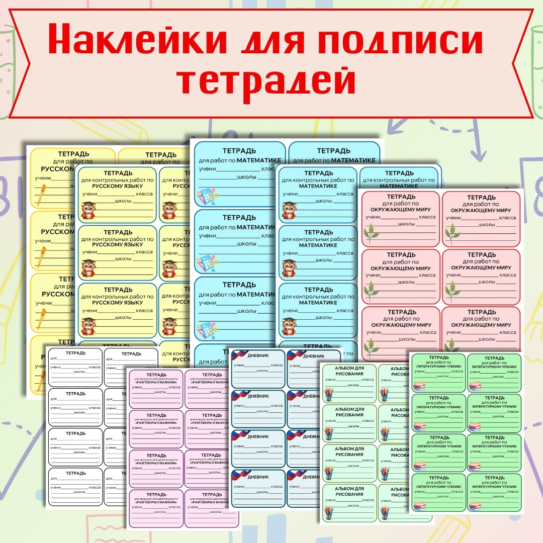 Наклейки для подписи тетрадей помогут быстро и красиво оформить школьные тетради, дневники и альбомы. Что входит в комплект: Удобный формат — 8 наклеек на листе формата А4. Подходит для: Начальной и средней школы. Быстрого оформления всех тетрадей и рабочих материалов. Учителей, родителей и самих школьников. Преимущества: все наклейки выполнены в едином стиле; чёткие надписи, много свободного места для заполнения; наклейки можно использовать в начале года и в течение учебного процесса. Формат: PDF, готово к печати. Скачать можно: Комплект поможет сэкономить время и сделать школьные принадлежности аккуратными и удобными в использовании!