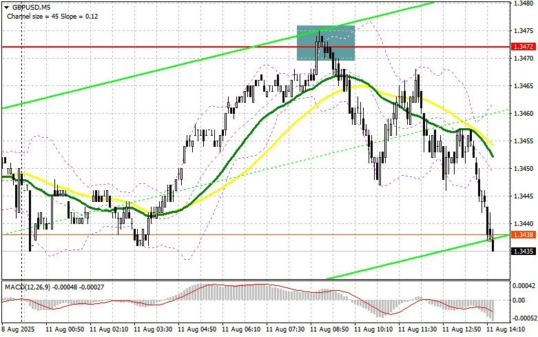 В своем утреннем прогнозе я обращал внимание на уровень 1.3472 и планировал от него принимать решения по входу в рынок. Давайте посмотрим на 5-минутный график и разберемся с тем, что там произошло. Рост и формирование ложного пробоя в районе 1.3472 привели к точке входа на продажу, что вылилось в падение пары более чем на 40 пунктов. На вторую половину дня техническая картина не пересматривалась.