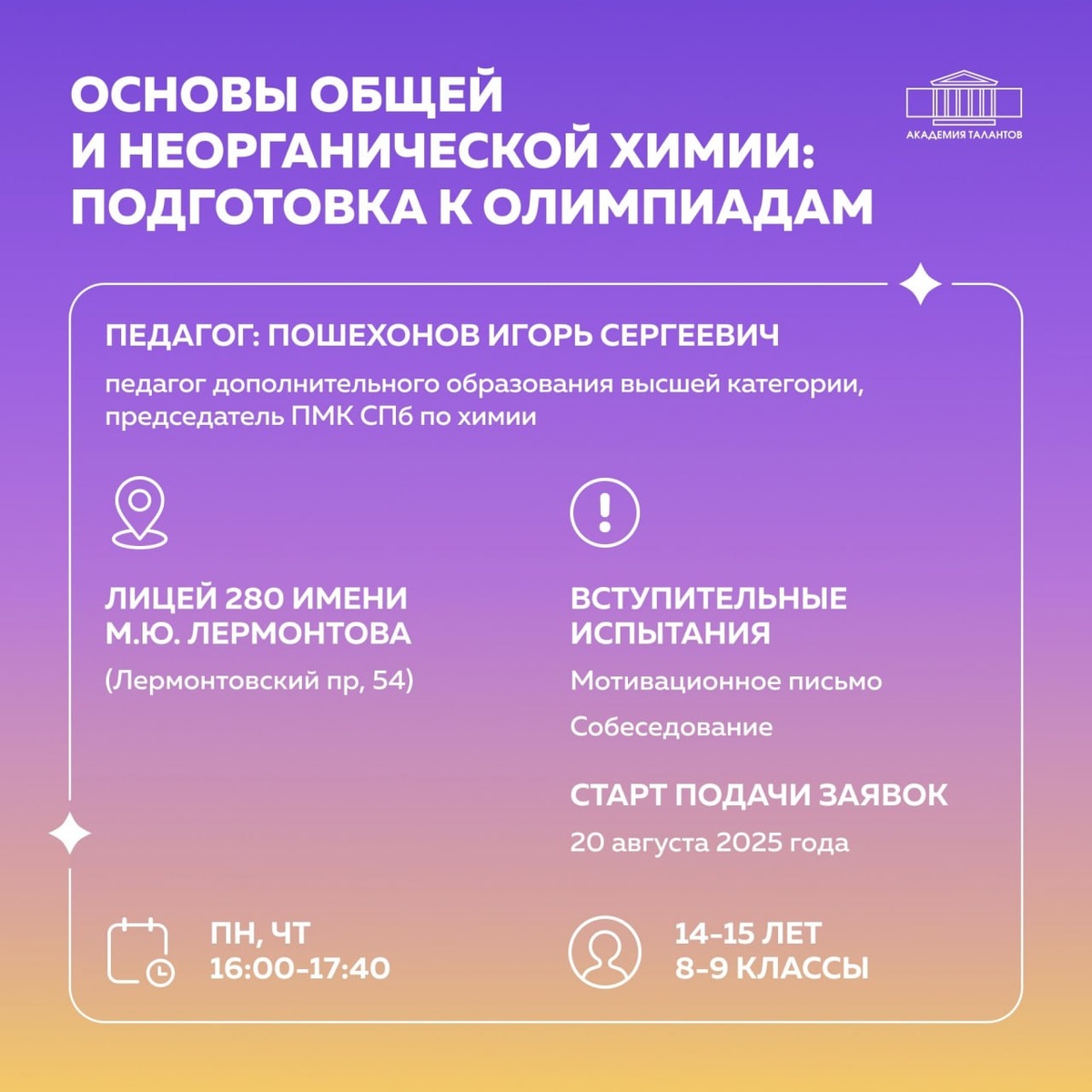 🌟📌 Химия органическая и неорганическая: какую выбираешь ты? Центр олимпиад и Академия талантов предлагают на выбор две программы. Обучение бесплатное. ✅ Основы общей и неорганической химии ✅ Органическая химия Что узнаешь на программе по неорганической химии? ✨ типологию олимпиадных задач ✨ приемы и методы решения задач ✨ основы качественного анализа Чему научишься на курсе органической химии? ✨ основам органической химии ✨ разным подходам к решению задач 💥 Опытные педагоги и ребята, которые разделяют твои увлечения в области химии, ждут встречи с тобой! ‼️ Внимание! В этом году мотивационное письмо нужно будет заполнить непосредственно при регистрации в системе «Навигатор» ✅ Регистрация начнётся 20 августа 🔗 vk.cc/cO6WHM 🔗 vk.cc/cO6WMF