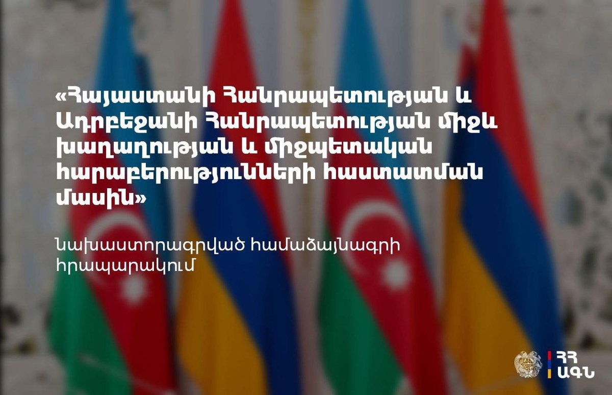 Փոխադարձ համաձայնությամբ, հրապարակվում է «Հայաստանի Հանրապետության և Ադրբեջանի Հանրապետության միջև միջպետական հարաբերությունների հաստատման մասին» նախաստորագրված համաձայնագիրը. ՀՀ ԱԳՆ