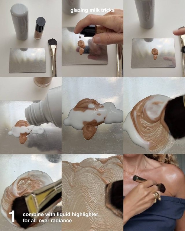 Помните, как в детстве мы добавляли блестки буквально во всё? Так вот, этот способ — его взрослая, элегантная версия! Смешайте любимый жидкий хайлайтер с молочком Rhode и нанесите эту волшебную смесь на лицо, шею и декольте. Результат? Такое деликатное сияние, будто вы только что вернулись из спа-салона премиум-класса! Особенно актуально для наших серых будней — когда за окном пасмурно, а выглядеть нужно на все сто! ✨ Способ №2: Тональный крем вашей мечты