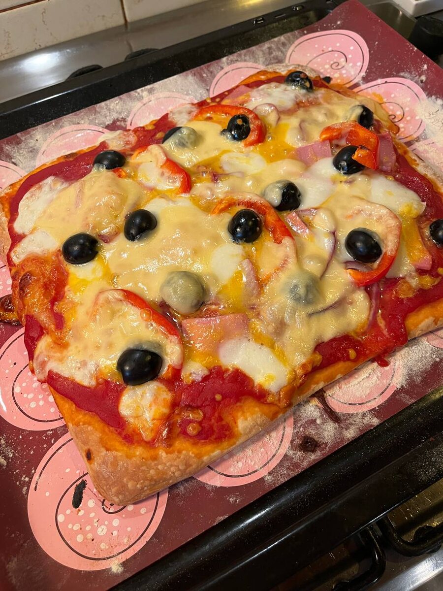 Если вдруг забыли, как выглядит и из чего делается домашняя пицца — напоминаю🤣 У меня есть классный рецепт теста (позже его выложу), но в этот раз в доме было холодно, а тесту нужен час в тепле. Поэтому я просто достала из морозилки готовый пласт дрожжевого теста. Начинка может быть любой, в этот раз я сделала так: • основа — протёртые томаты (вместо томатной пасты, вкус ярче) • колбаса — салями и докторская • болгарский перец • лук • оливки — целая банка • три вида сыра — моцарелла, остатки тертого сыра с завтрака и маасдам Приготовление: • Тесто раскатать на силиконовом коврике. • Смазать протёртыми томатами. • Выложить начинку. • Разогреть духовку до 220°С. • Запекать 15 минут. Пицца получается ароматной, с расплавленным сыром и сочной начинкой. Отличный вариант, когда нужно быстро приготовить что-то вкусное. ❤️ ❤️ ❤️ Забирай подборку >> по ссылке <<, с которой ты перестанешь тратить время у плиты🔥