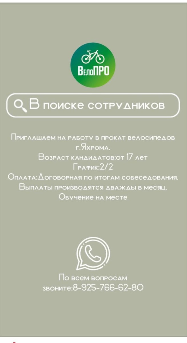 Требуется сотрудник пункта проката велосипедов в г. Яхрома