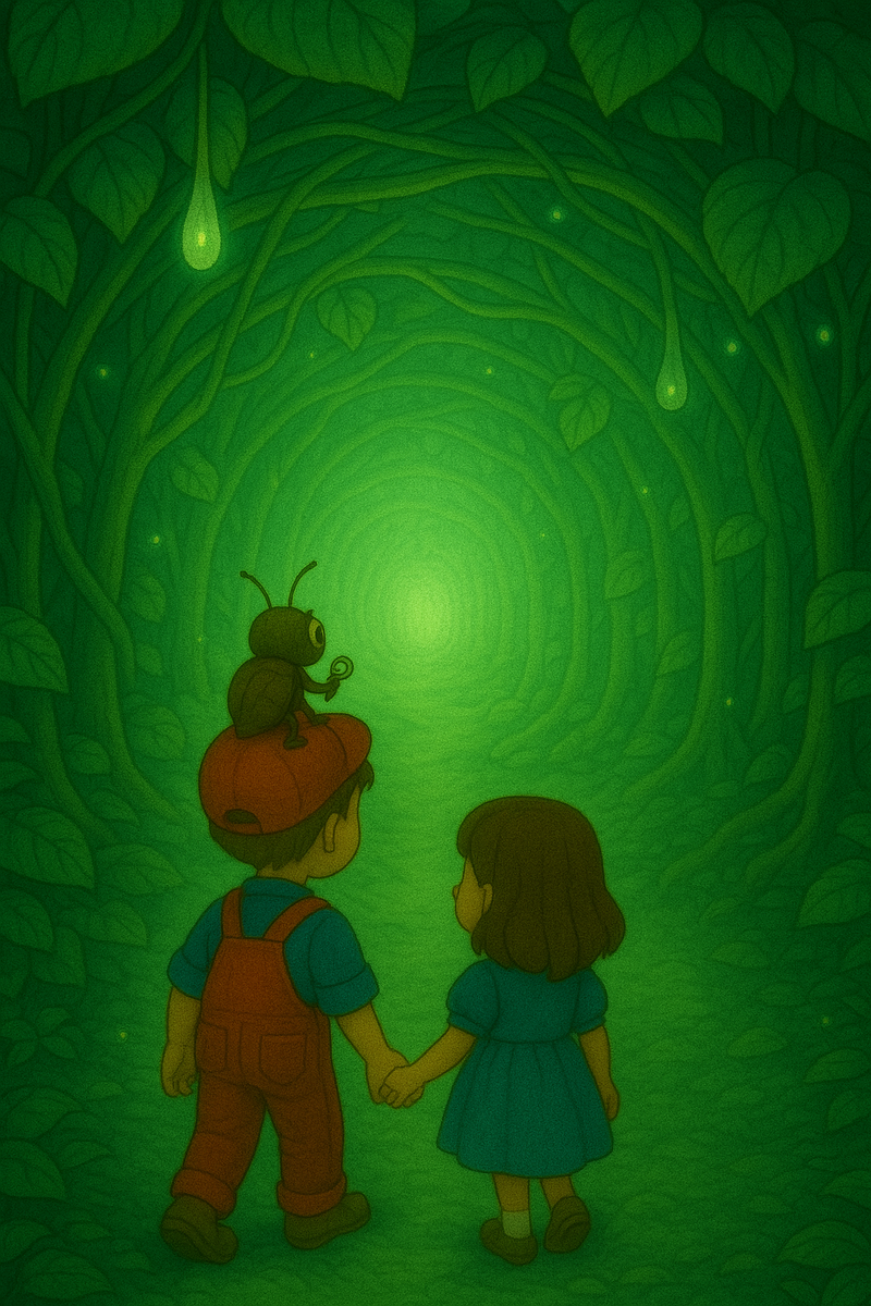 Они падали в сторону мерцающего куба, который рос на глазах, пока не стал размером с небольшой дом. Но в последний момент их траектория изменилась: словно кто-то невидимый подхватил их и перенаправил в сторону. — Эй! Мы мимо! — закричала Шайбочка, но ветер заглушил её. Вместо куба они влетели в высокую арку из переплетённых стеблей. Листья моментально сомкнулись за спиной, и шум сада остался где-то там, снаружи. Впереди тянулся длинный тоннель, весь залитый мягким зелёным светом. — Это что… мы внутри растения? — удивился Болтик, оглядывая пол, пружинящий под ногами.