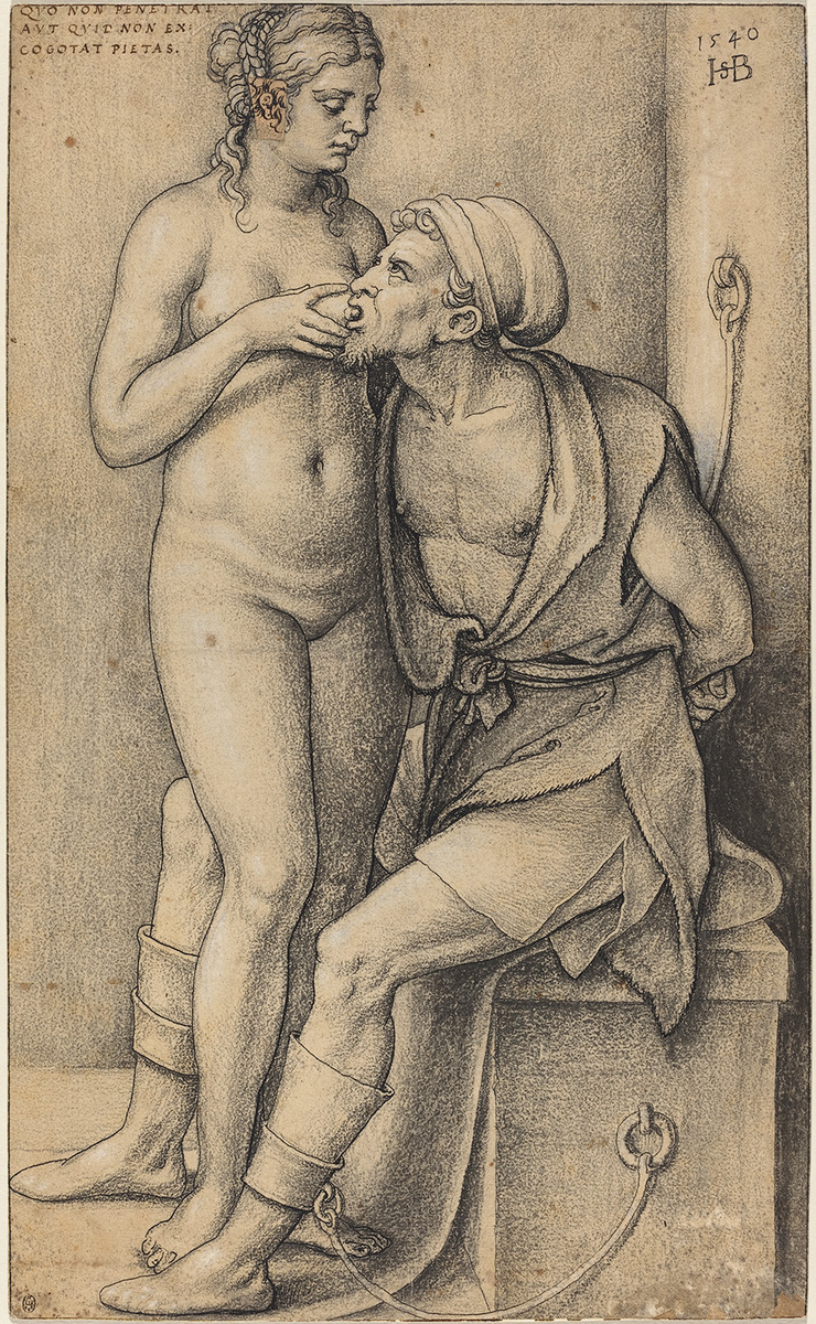 Менее активный как живописец, чем его младший брат Бартель (1502–1540), Себальд Бехам работал в основном как гравёр; он также писал миниатюры и оформлял витражи, фонтаны и медали. Из-за небольшого размера многих гравюр обоих братьев они получили прозвище Kleinmeister ("Маленькие мастера"). И Себальд, и Бартель жили в Нюрнберге до 1525 года, когда они были изгнаны за выражение еретических взглядов. Впоследствии Себальд работал в Ингольштадте, Мюнхене, а с 1532 года — во Франкфурте-на-Майне. В 1540 году он стал гражданином Франкфурта, отказавшись от гражданства Нюрнберга в 1535 году. Историю пожилого афинянина Кимона и его дочери Пиро рассказывает древнеримский писатель Валерий Максим. В тюрьме в ожидании казни, где ему не давали еды, Кимона навещает его дочь Перо, молодая мать, которая кормит его грудью. Являясь примером сыновней почтительности в античной литературе, эта тема стала известна в гуманистических кругах как "римское милосердие" и часто иллюстрировалась в XVI-XVIII веках