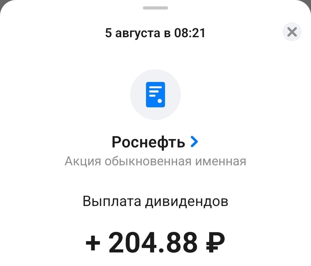 Всем привет! 👋 Какие изменения произошли у меня в портфеле в августе? Рассказываю 💁🏼♀️ 1) 5 августа пришли дивиденды от Роснефти 204,88 рублей 2) пополнила свой портфель на 2000 рублей 3) продала акции фонда Ликвидность на 3350 рублей 🤑 В этот раз я решила, что непременно должна выбрать для себя "подходящие" облигации 😅 и вот, что смогла купить: Купила облигации ОФЗ с переменным купоном - 3 штуки. Сегодня добавила в портфель ещё облигаций МТС - 2 штуки и теперь у меня их три) Вот и все мои покупочки в августе. Спасибо всем, кто дочитал эту статью🫶 ❗☝не является инвестиционной рекомендацией❗