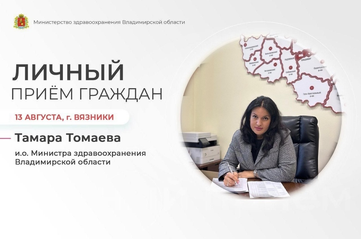Тамара Томаева проведет личный приём граждан в Вязниках. И.о. Министра регионального здравоохранения Тамара Шамильевна Томаева встретится с гражданами 13 августа. 📌Приём будет осуществляться по предварительной записи. Записаться можно 8, 11 и 12 августа по телефону: 8(4922)42-03-16. ✅8 и 11 августа - с 9.00 до 17.30 (перерыв с 12.30 до 13.00). ✅12 августа - с 9.00 до 12.00. Встреча состоится в поликлинике Вязниковской районной больницы по адресу: г. Вязники, ул. Льва Толстого, 4. #личныйприем #министр