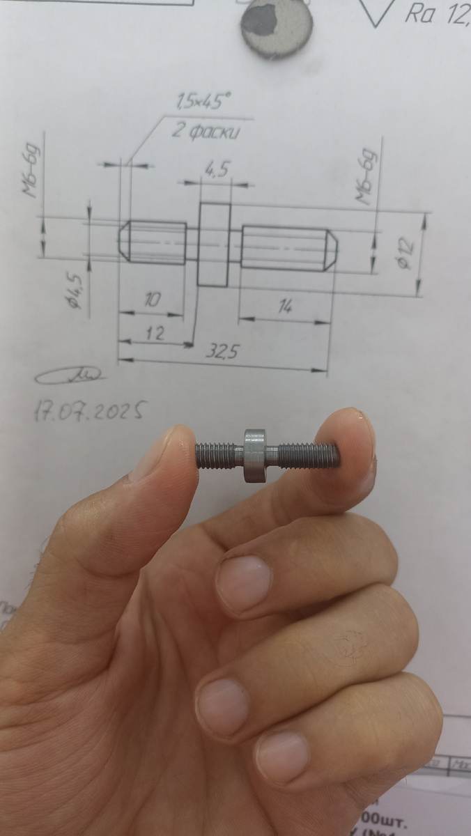 Всем привет. Сегодня хочу рассказать про шпильку. На вид элементарная деталь, планировали в первом шпинделе протачивать, делать канавку, резать резьбу резцом, делать выборку под резьбу со второй стороны, канавку и отрезать. Во втором шпинделе чистовой проход под резьбу и нарезка резьбы плашкой. Все наладили, все поставили, но при нарезании резьбы плашкой деталь поворачивает и утаскивает в цангу. Хоть по паспорту станок может резать резьбу, по факту не получилось. Возможно маленькая площадка зажима. Пришлось переписать программу и делать все в первом шпинделе. Добавили обратно проходной резец для проточки под резьбу со второй стороны, сделали канавку для выхода резьбового резца в месте где будем отрезать. Перехватили деталь, нарезали резьбу резцом, базируя деталь двумя шпинделями, и затем отрезали. Со второй стороны деталь поехала сразу в лоток. Детали получились хорошие, во время изготовления партии проблем не возникло. При течение в один проход сильно наматывается стружка на и