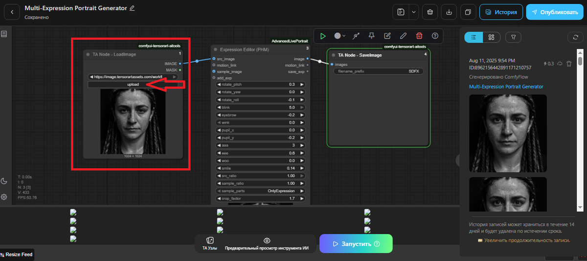 Загружаете серьезный портрет, а получаете улыбающегося персонажа. Или наоборот — делаете из счастливого лица задумчивого мудреца. Multi-Expression Portrait Generator в TensorArt позволяет управлять каждой мимической мышцей: от легкого наклона головы до интенсивности улыбки. В статье: подробный разбор 15+ параметров управления эмоциями, готовые настройки для популярных выражений лица и пошаговая инструкция для новичков. Multi-Expression Portrait Generator — это специальный workflow (рабочий процесс) на платформе TensorArt, который позволяет изменять выражение лица на портретах с помощью искусственного интеллекта. Простыми словами: вы загружаете фотографию человека, а система может сделать его грустным, веселым, удивленным или изменить положение головы и глаз. Лицо должно быть хорошо видно и освещено. Основная магия происходит в блоке Expression Editor (PHM) - здесь расположены все параметры для изменения выражения лица. 📐 Управление головой и ориентацией • rotate_pitch (наклон голо