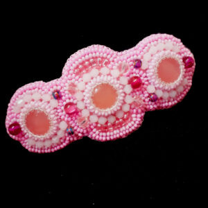 Материалы: кабошоны, бусины разных размеров, бисер 10/0 и 15/0 разных оттенков, нить, игла, фетр, кожа (кожзам, фетр для изнанки), заготовка для заколки Процесс: https://youtu.be/u4h15NDlz1g и https://rutube.ru/video/cf8479f013e22370d8678f1b47cf7e84/ Подготовить примерный эскиз, исходя из имеющихся материалов. Кабошоны могут быть любой формы, но не сильно большие и тяжёлые Приготовить фетр, сделать на нём разметку. Мой фетр тонковат, поэтому я прикрепила его на пялцы Центральный кабошон обвести по контуру и по этому контуру пришить чётное количество бисера. Сверху проплести мозаичным плетением до нужной высоты Приклеить кабошон к фетру, затянуть нить на оплётке и проплести пару рядов 15/0 бисером По кругу пришить биконусы или другие имеющиеся бусины. Если они крупные, то можно пройти нитью по 2 раза Пришить сбоку бусину как на эскизе Пришить 2 бисерных ряда вокруг бусины Пришить следующую ближайшую бусину И вышить 2 бисерных ряда вокруг неё И также пришить бусину и 2 ряда бисера в ниж