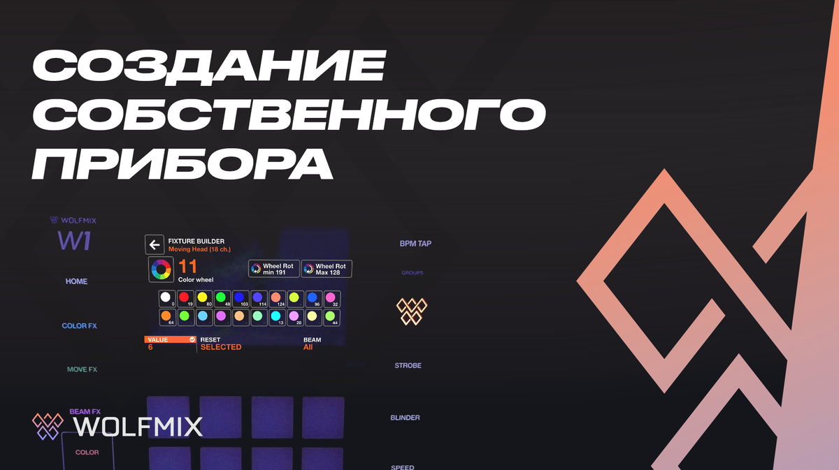Профиль прибора сообщает Wolfmix, как работает подключённый световой прибор. Он содержит информацию о функциях каждого канала. Ознакомьтесь с руководством пользователя вашего прибора — там вы найдёте таблицу DMX-каналов и соответствующих значений. В документации часто много информации, но Wolfmixу обычно требуется не всё. Начните с установки Test Address (тестового адреса) с помощью первого энкодера. Это значение должно совпадать с номером, установленным на самом приборе, чтобы он реагировал во время создания профиля. Укажите количество лучей (beams): у LED-приборов, сканеров и поворотных головок обычно один луч. У Multi-FX баров и LED-панелей их, как правило, больше. Используйте сенсорный экран или нажмите на кнопки матрицы, чтобы добавить и редактировать каналы. Выберите тип канала, соответствующий описанию в руководстве. У прибора на изображении ниже — 18 каналов, начинающихся с Pan и Tilt. Некоторые каналы имеют дополнительные параметры. Например, канал Color Wheel (цветовой дисков