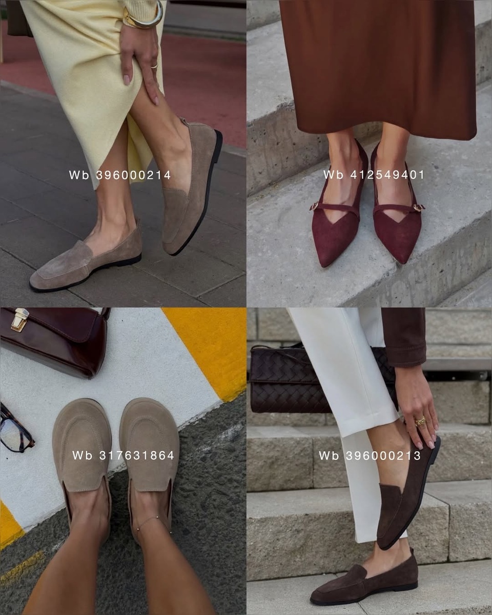 - WB 306135447 — лоферы бежево-серые, мягкий верх. Посадка как у домашней обуви, но выглядят собранно.