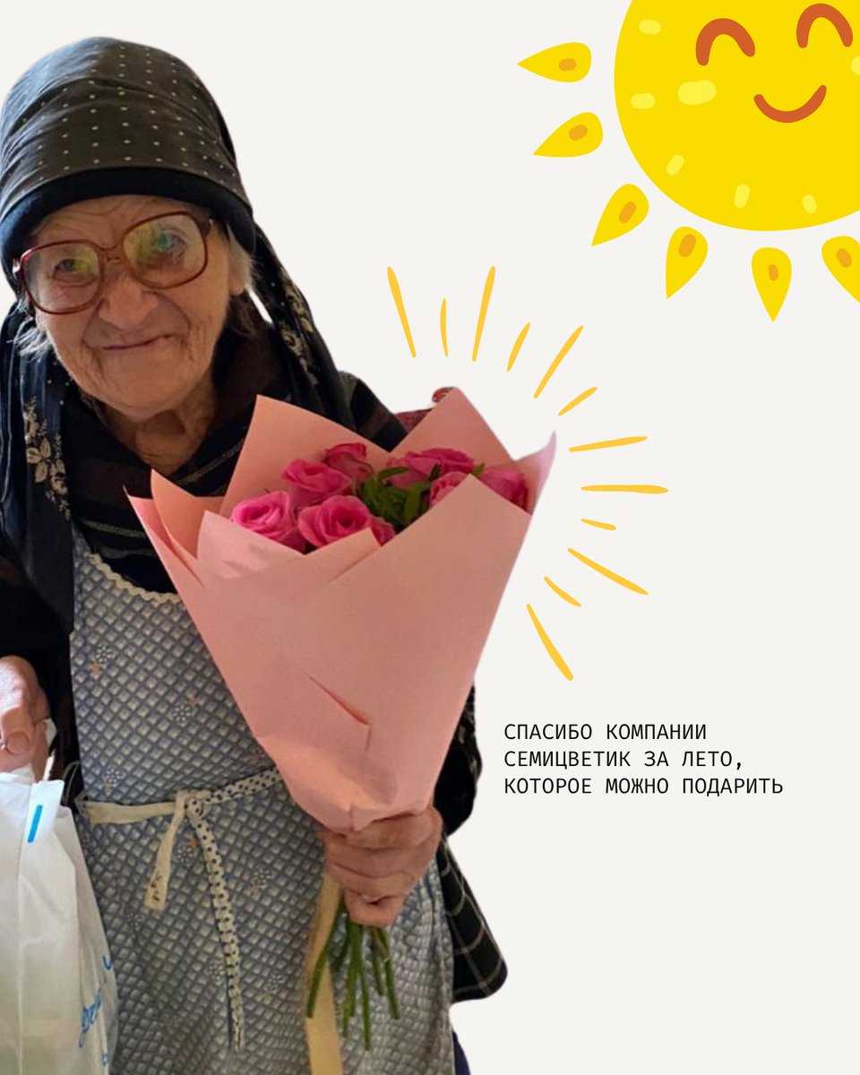 Что может быть ярче лета? Наверное, только лето в букете — когда в нём тепло, нежность и внимание. Именно такие букеты мы дарим нашим бабушкам и дедушкам вместе с нашими друзьями из компании «Семицветик». Вот уже не первый год они создают для наших подопечных настоящие цветочные чудеса — живые, тёплые, с характером. Такие, какие запоминаются и остаются в сердце. Цветы от «Семицветика» — это не просто поздравление с днём рождения. Это момент радости, ощущение красоты, прикосновение к празднику. Они будто говорят: «Ты важен». «Ты не один». «Ты достоин любви». Иногда один букет может стать началом разговора, поводом для воспоминаний, а иногда — просто моментом тишины и счастья. Благодаря «Семицветику» в жизни наших подопечных становится чуть больше света и смысла. Спасибо за вашу доброту, вкус, неизменную поддержку. Вы — как солнечный луч, который приходит вовремя.