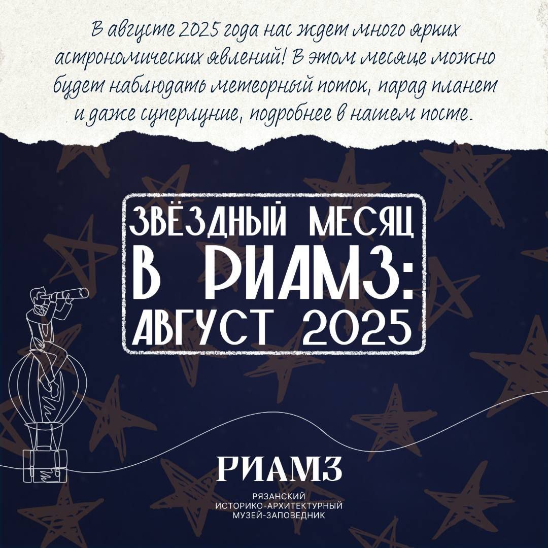 Звёзды говорят... смотрите на звёзды! 🌠 Музейный центр РИАМЗ опубликовал 🔭 астропрогноз на август – все эти парады планет, сближения, пояс Ориона и прочее можно наблюдать невооружённым глазом в рязанском небе. Есть ещё один вариант – сходить в планетарий. Там как раз кино про вселенную показывают. Афишу найдёте здесь. #гуляка_мероприятия 🤩 Рязанский гуляка