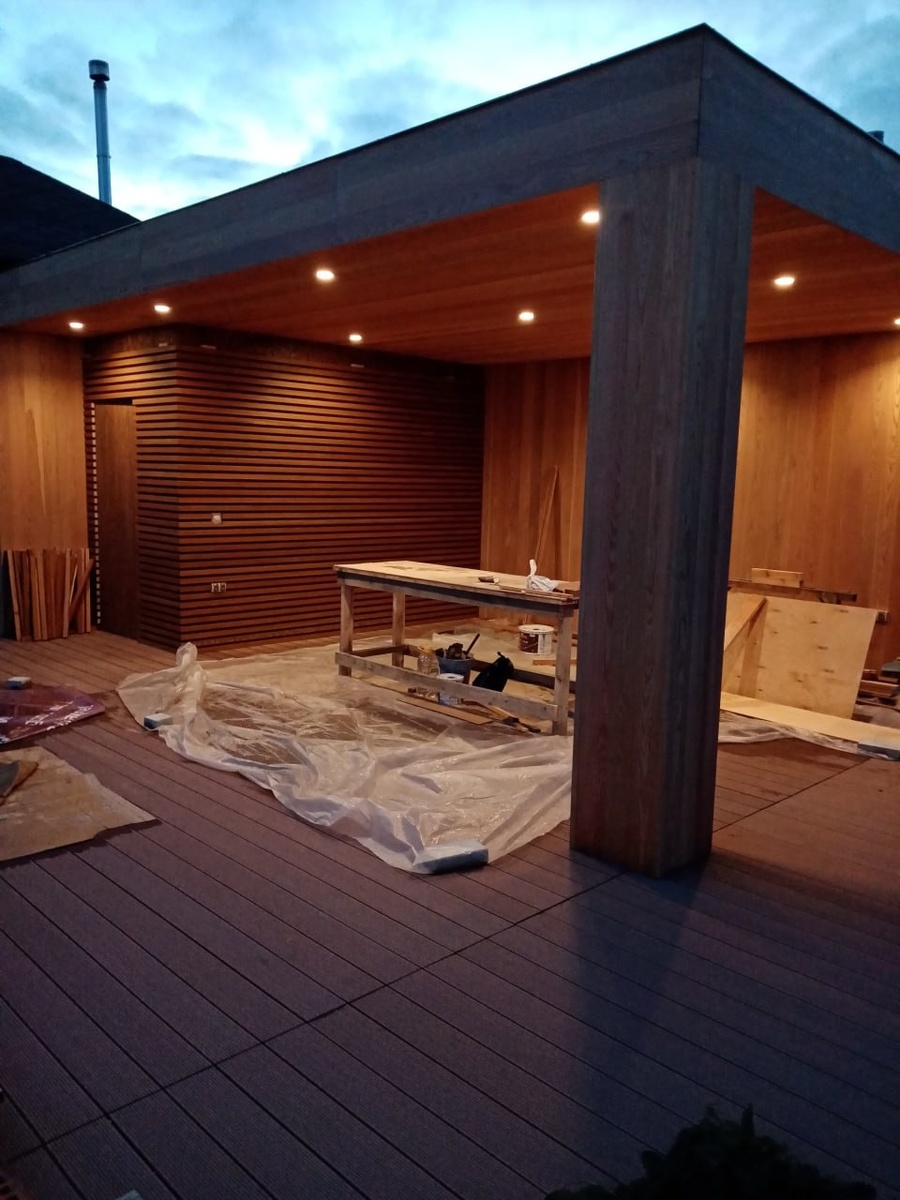 Один из моих объектов,который я спроектировал и вдвоем с напарником построили в 2020 году,когда был лок-даун....Беседка с хоз.блоком,материалы-стальной сварной каркас,обшивка-лиственница,полы-декинг(древесно-полимерная доска),размер строения 5х9 метров.Освещение точечное,но с равномерным распределением.