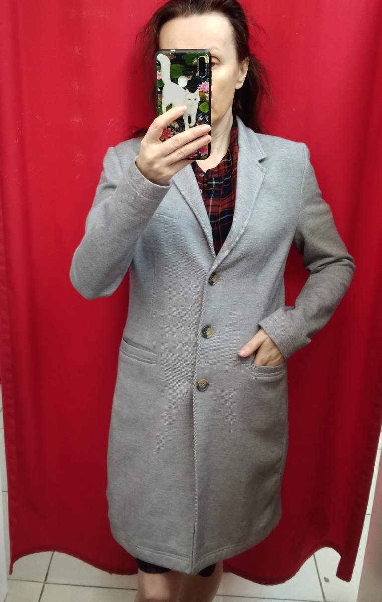 Здравствуйте, продолжу обзор из секонда, цена 590 за кг и ещё сверху скидка 25%. Это очень длинный жакет или очень легкое пальто, не знаю как обозвать. Трикотажное полотно с приличным содержанием хлопка. Бежевый пуловер абсолютный унисекс, он такой классический, спокойных тонов. Скорее мужской, но размер небольшой. Хлопок и акрил. Под стать ему длинный кардиган нюдового оттенка. Тонкий и плотный трикотаж. Джинсы и кардиган – идеальный вариант на каждый день, а бежевый с синим смотрится очень нежно. Без состава и бренд обрезан. Джемпер красивого синего цвета с белоснежными полосками. Очень мягкий неплотный трикотаж, хотя крупная вязка смотрится грубовато, а эта вешалка вообще ему красоты не добавляет, хотя на фигуре будет смотреться по другому. Хлопок и акрил. Короткое зимнее пальто. Неплохо утеплено, капюшон на меховой подкладке. Подозреваю, что осталось из-за небольшой длины. Длинный жилет из толстенького полиэстера, вроде белой косушки)), даже ремешки есть по краям. Если пестреньк