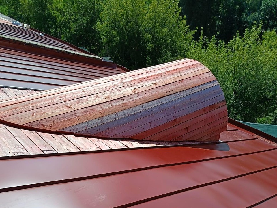 11 августа. /MEDIA TALK/. В подмосковном Красноармейске ведутся работы по возвращению первоначального вида слуховым окнам старинного здания, возведенного в XIX веке. Реставрация затрагивает элемент кровли памятника архитектуры регионального значения. Фото: Екатерина Мелкозерова