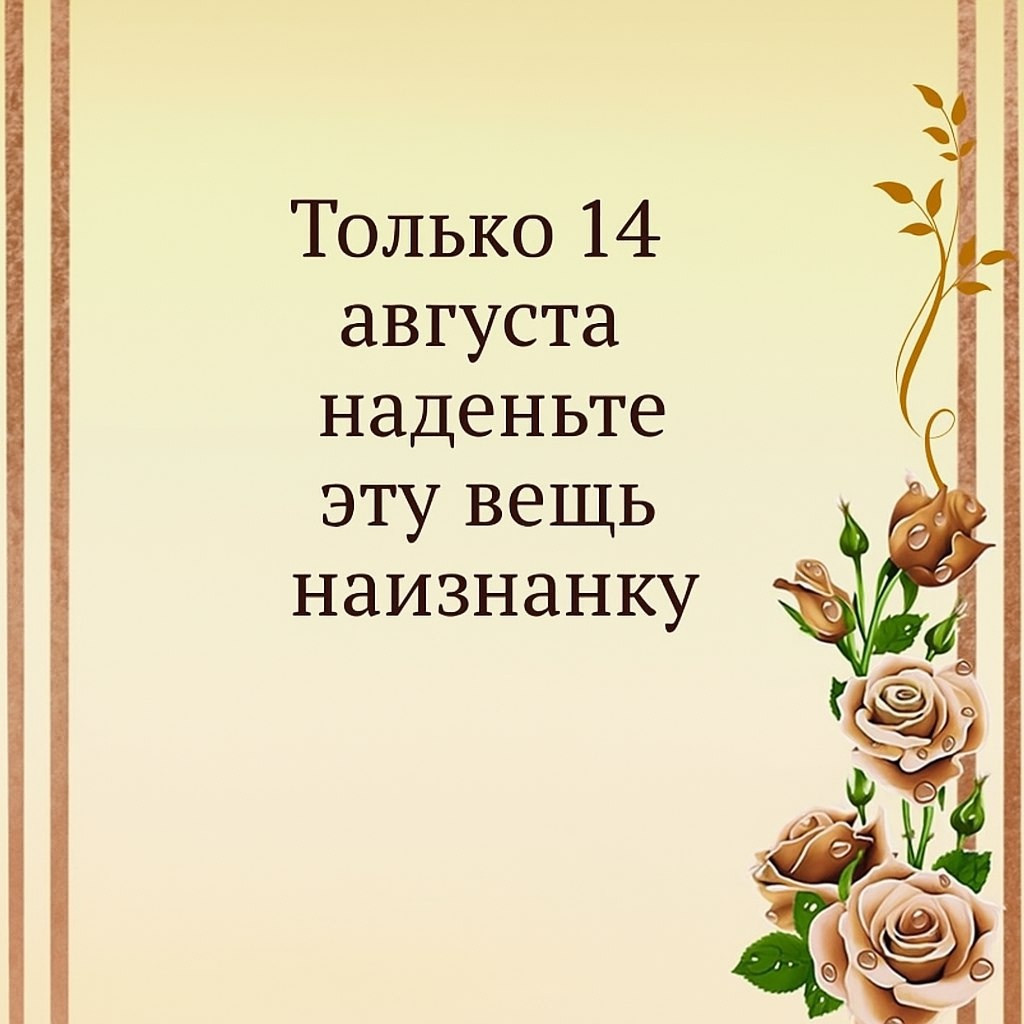 ДОРОГИЕ ДУШИ В ПОИСКЕ ГАРМОНИИ И СИЛЫ! Есть дни необычные — когда невидимая нить связывает людей и время, обычаи и энергию, древние тайны и ваши личные перемены. 14 августа — особенный порог, начало Успенского поста и Первый Спас (Медовый), день перекрестка между летом и осенью, чистоты дома и крепости тела. В этот момент пространство особенно отзывчиво к символическим поступкам: их сила многократно возрастает, потому что включается поддержка не только ангелов, но и всего народного эгрегора, идущего из глубины веков. Люди испокон веков искали способы “запрограммировать” свою жизнь на здоровье и благополучие. И именно в этот день сработает простой, но мощный магический ритуал — если последуете ему с верой и нежностью к себе! САКРАЛЬНЫЙ ОДЕЖДНЫЙ КОД ДНЯ Есть на свете предмет, который вы надеваете каждый день, но редко придаёте ему значение, и всё же с ним связано множество старинных, забытых обрядов. Это не амулет, не пояс, не платок, не рубаха… Сегодня разговор — о простом предмете, к