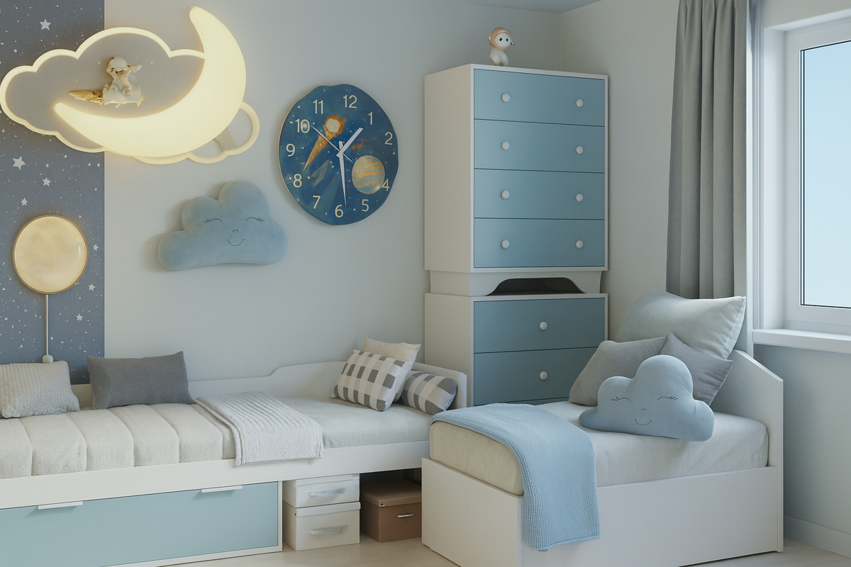 Детская — это постоянно меняющаяся сцена. Сегодня здесь космическая миссия, завтра — тихий домик с книжкой. В каждом из пяти проектов я заложила модульность: меняйте постеры, перекладывайте подушки, переставляйте корзины — и пространство «обновляется» без ремонта и больших трат. Все позиции можно собрать напрямую на WILDBERRIES по артикулам с фото — быстро, просто и с гарантированным попаданием в стиль.
