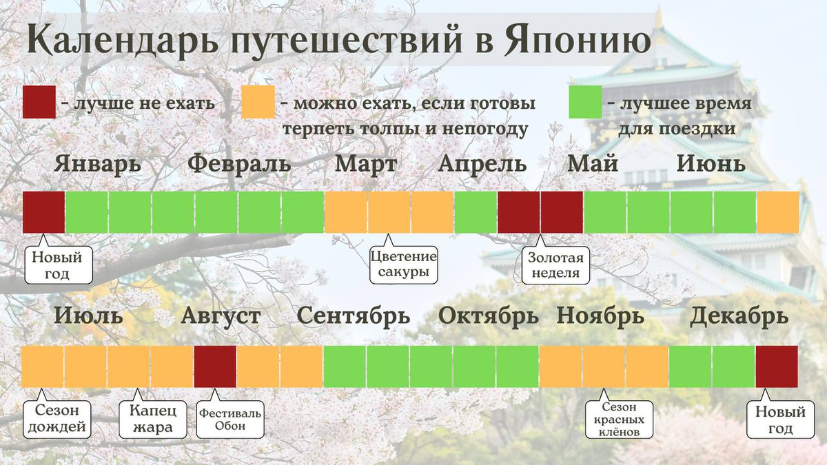 Жёлтый - сезон сакуры и сезон красных клёнов, когда точно будут толпы иностранных туристов. Кроме этого сюда же отнесла летний сезон дождей и когда там больше 30 градусов. Но кого-то, может, наоборот это не отпугнёт.