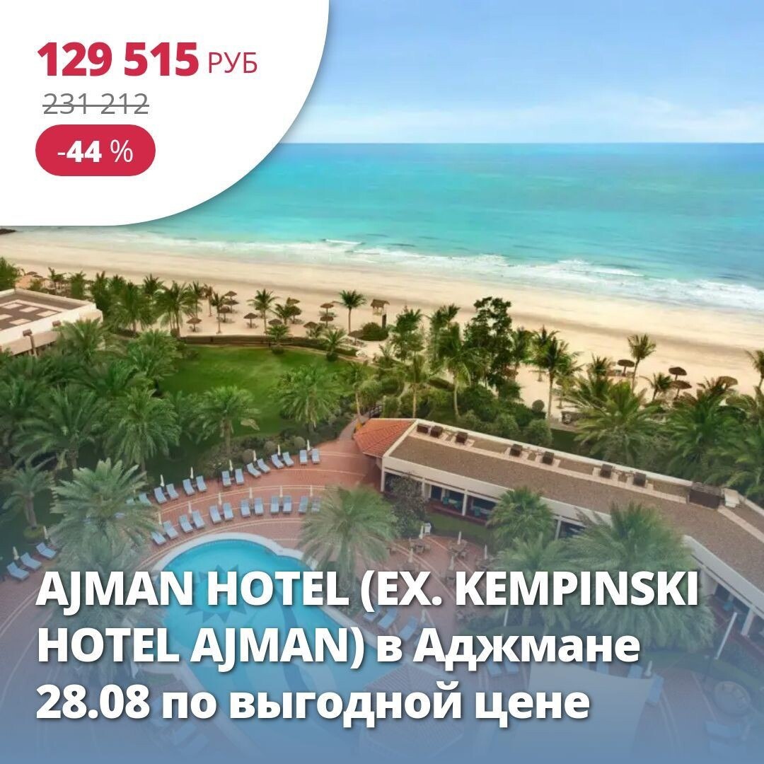 🔥 Цена тура: 129 515 руб/чел ❤️ AJMAN HOTEL (EX. KEMPINSKI HOTEL AJMAN) в Аджмане 28.08 по выгодной цене 🏠 5*, ОАЭ из Москвы 28 августа на 14 ночей, Завтрак. AJMAN HOTEL (EX. KEMPINSKI HOTEL AJMAN) 5* Отель на побережье, в тихом месте, на небольшом удалении от основных торговых и развлекательных центров. Красивая зелёная территория. Рекомендуем для семейного пляжного отдыха. Ласковое солнце и теплые воспоминания ждут Вас! Подробнее здесь: https://starttime.ru/search-tours?tvcard=gj9gam Лучшие туры https://starttime.ru/search-tours #ЛучшийТур #СтартТайм