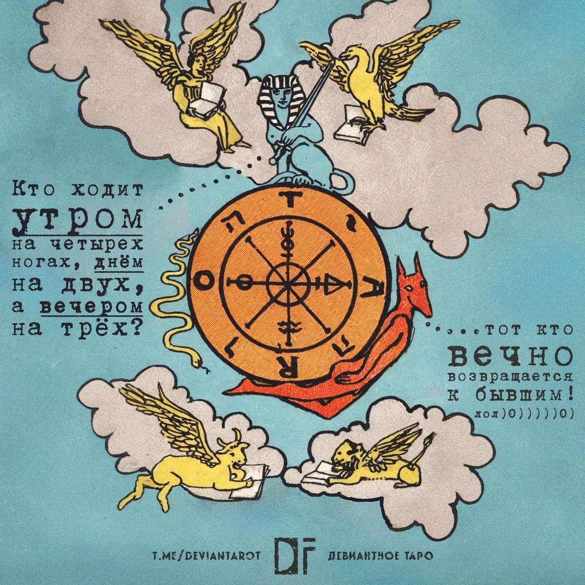 Сегодня на колесе барабане заметка, которую ваш покорный слуга писал для Аввалон Ло Скарабео. Мне кажется вам тоже будет интересно. 🎰 Колесо Фортуны - это не только «удача» или «воля судьбы». Это также символ цикличности, повторов и переходов. Поднимаясь на вершину - будь готов быть сброшенным вниз. Колесо показывает: - смену фаз (то вверх, то вниз), - движение без четкого контроля, - возвращение в знакомые сценарии; - что-либо сезонное 😱 В чувствах КФ проявляется как некоторая неустойчивость: - сегодня тянет, завтра - отстранение, - импульс сблизиться сменяется холодом, - влюбленность превращается в раздражение; - курортные романы (сезонность); Такая динамика - не признак манипуляции. Это показатель того, что человек сам не понимает, что с ним происходит. Чувства цикличны, не интегрированы и потому неустойчивы. 🎰 На перспективу отношений Колесо часто указывает на замкнутый круг: - одни и те же паттерны, - повторение старых ролей, - вовлеченность в сценарий, который уже был (только