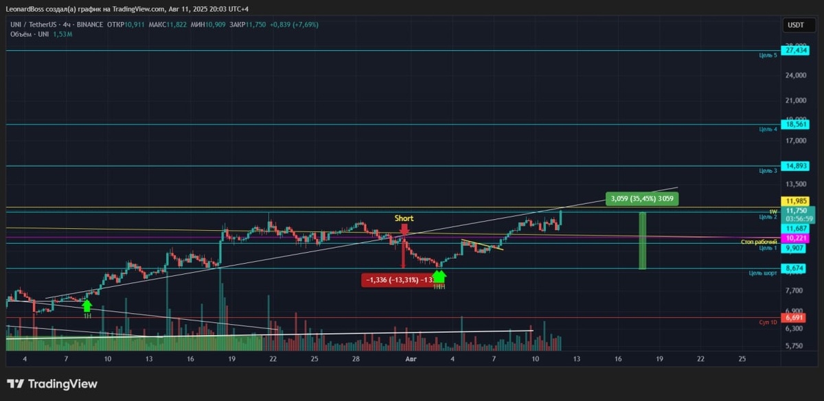 В ответ на пост #UNI 🔼🔼🔼 ⚠️Медленно, но уверено, без резких откатов дополз до 2й цели! В случае выхода обратно на трендовую и недельный уровень поедет к следующим целям!!