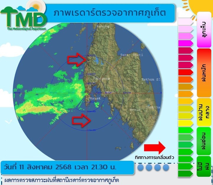 Пхукетский метеоцентр (Phuket Met) пока не объявлял штормового предупреждения, но снимки с метеорадара стабильно демонстрируют движущиеся с запада осадки. С учетом влияния шторма Подул (движущегося к Таиланду с востока) штормовое предупреждение вероятно.