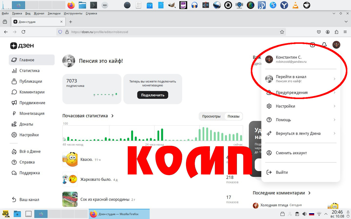Дело, собственно, про мой канал на Дзене. Сидеть за компуктером мне сейчас удаётся всё меньше. Падаю я со стула и удержаться на нём не получается. Решил попробовать писать статьи на ноуте, лёжа на диване. На диване падать некуда, я уже упавший. Проблема была в том что с ноута я на свой канал зайти не мог. С компуктера всё запросто а с ноута - хоть ты тут тресни. На компуктере я собственно и начал несколько лет назад заводить канал. По старой памяти всё получалось замечательно. Но не сейчас. Ходячим я недавно уже быть перестал, а теперь похоже перестал уже быть и сидячим.