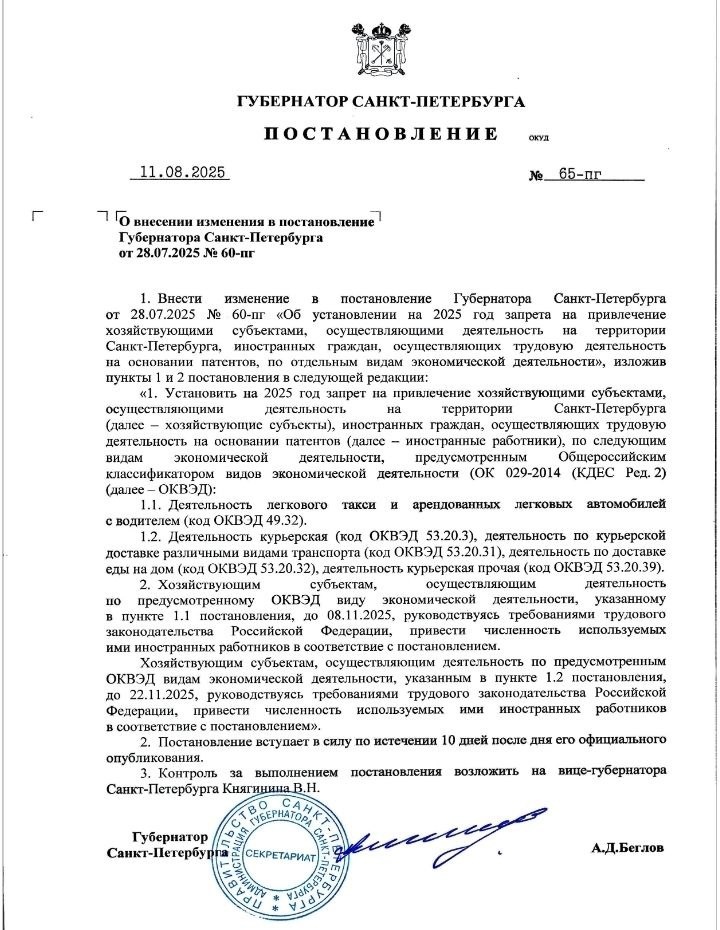 Постановление подписал губернатор города Александр Беглов, сообщает 11 августа пресс-служба Смольного.