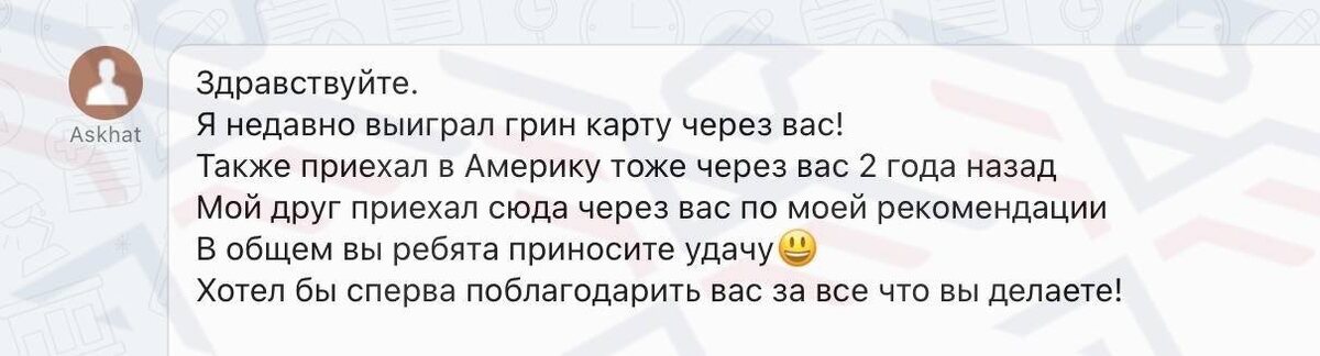 Недавно получили такой приятный #отзыв от клиента, который обращался к нам для заполнения его анкеты. Скоро снова открывается прием заявок, но страны допущенные к участию пока не огласили. Будете участвовать в этом году? 🔥 — да, конечно, не стоит упускать такой крутой шанс 🤬 — нет, выиграть невозможно 🤯 — понятия не имею, о чем идет речь, но стало интересно