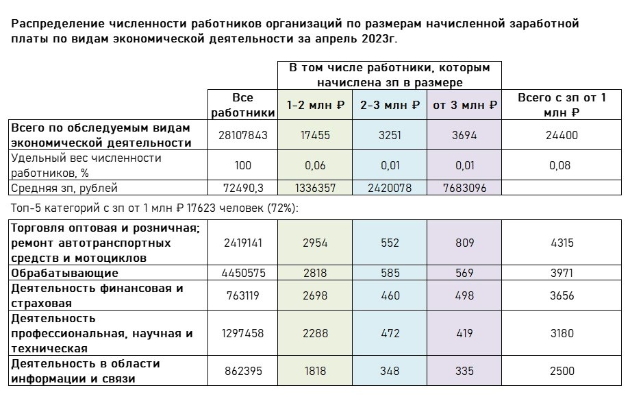 Росстат назвал число россиян с зарплатой от ₽1 млн в месяц Росстат 1 раз в два года собирает данные о зарплатах работников крупных и средних организаций всех видов деятельности и форм собственности за апрель месяц. Исследование проводилось среди 28,4 млн человек из 95,4 тысячи организаций. В 2025 году месячная зарплата у 45 427 россиян (0,16% от всех участников исследования) оказалась выше ₽1 млн против 24 400 (0,8%) в 2023 году. При этом от ₽2 до ₽3 млн в месяц заработали 5 728 человек (против 3 251 в 2023), а от ₽3 млн — 5 301 (против 3 694). В топ-5 в 2025 году с зп от ₽1 млн вошли следующие направления: • Деятельность в области информации и связи — 9 930 человек (в 2023 — 2 500 человек); • Торговля оптовая и розничная; ремонт автотранспортных средств и мотоциклов — 6 673 (4 315); • Обрабатывающие производства — 6 301 (3 971); • Деятельность финансовая и страховая — 6 206 (3 656); • Деятельность профессиональная, научная и техническая — 5 303 (3 180). На топ-5 категорий