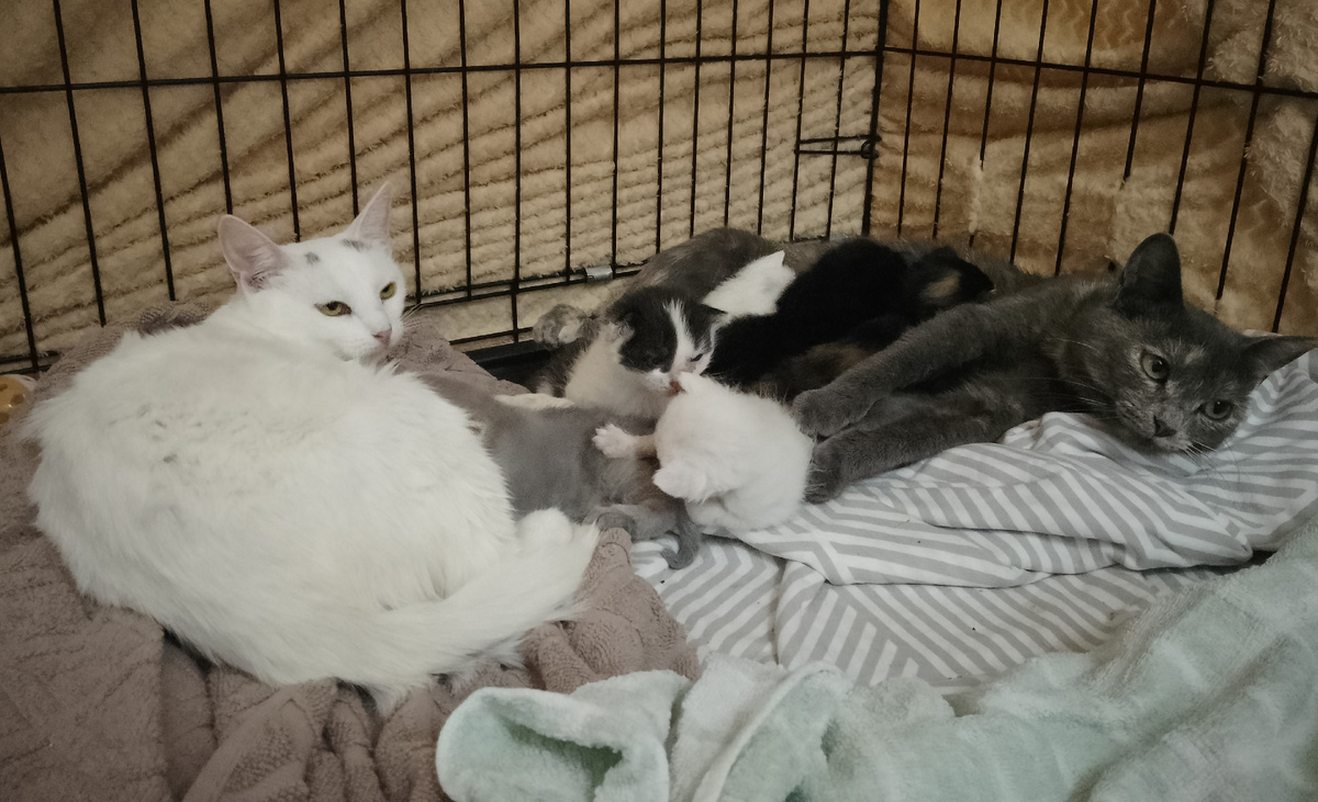 Я вчера заснула прямо в процессе работы над статьей о профилактике ХПН для Премиума. Прошу прощения, организм почуял отпуск и изо всех сил сопротивляется всякой полезной деятельности. И еще долгая болезнь сказывается (хотя я почти выздоровела вроде). Надеюсь, сегодня я этот черновик обязательно добью, и впредь статьи для Премиума будут выходить по воскресеньям как обычно Но сначала расскажу о том, какие имена получили котята Белоснежки и Веснушки, которым, кстати, уже две с половиной недели. Малявки отлично растут и с каждым днем все больше становятся похожи на настоящих котов, а не на кошачьи личинки. У каждого из них по-прежнему две матери. Голубые глазки давно у всех открылись (ушки тоже). Лапки окрепли, и котята заметно пошустрели. Теперь если юная мать Белоснежка уходит от детей в дальний конец вольера, дети её моментально находят. Причём, и её дети, и Веснушкины. Хотя у меня есть ощущение, что Белоснежкино изумление по поводу появления потомства не прошло. Хорошо, что ей удра